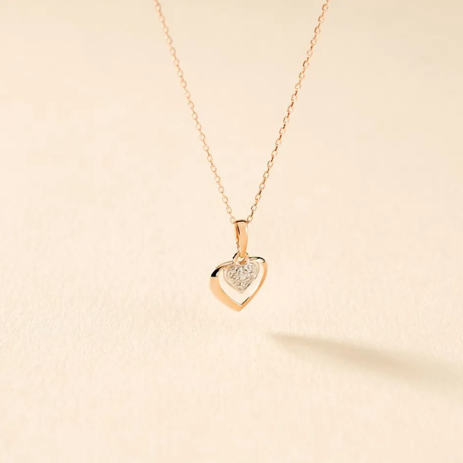 Collier Or Rose 375/1000 Forme C艙ur Ajoure + Semi Pavage Diamants 42cm