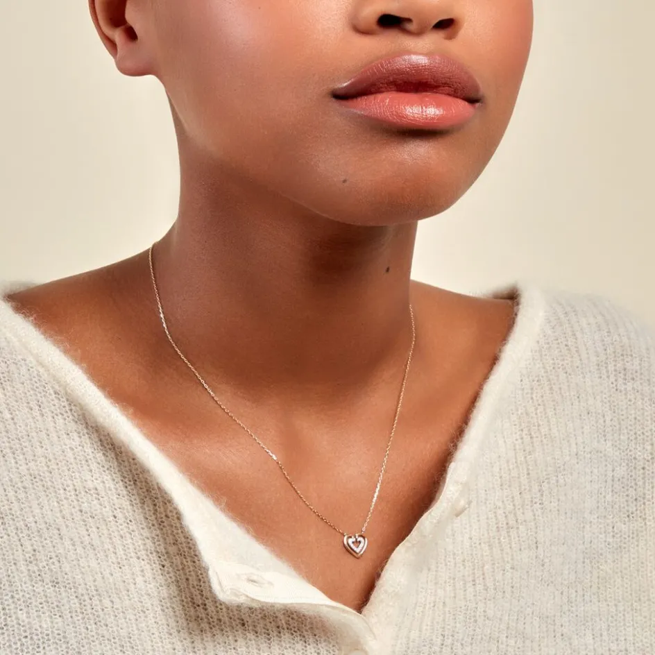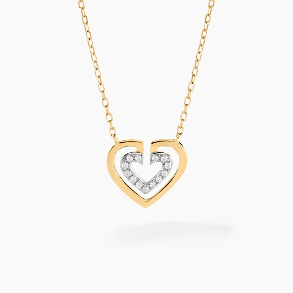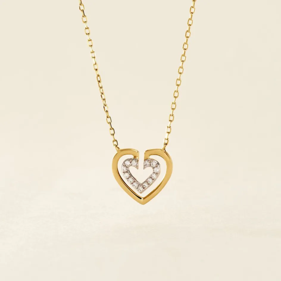 Collier Or Jaune 375/1000 Double C艙urs Ajoures Oxydes De Zirconium Micro Serti Maille Forcat Ronde 40+2cm