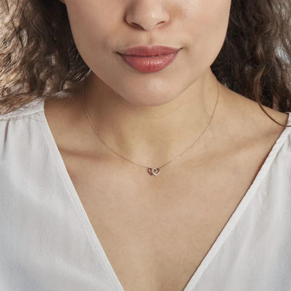 Collier Or Rose 375/1000 Forme Double C艙ur Maille Forçat Pavage Diamants 42cm