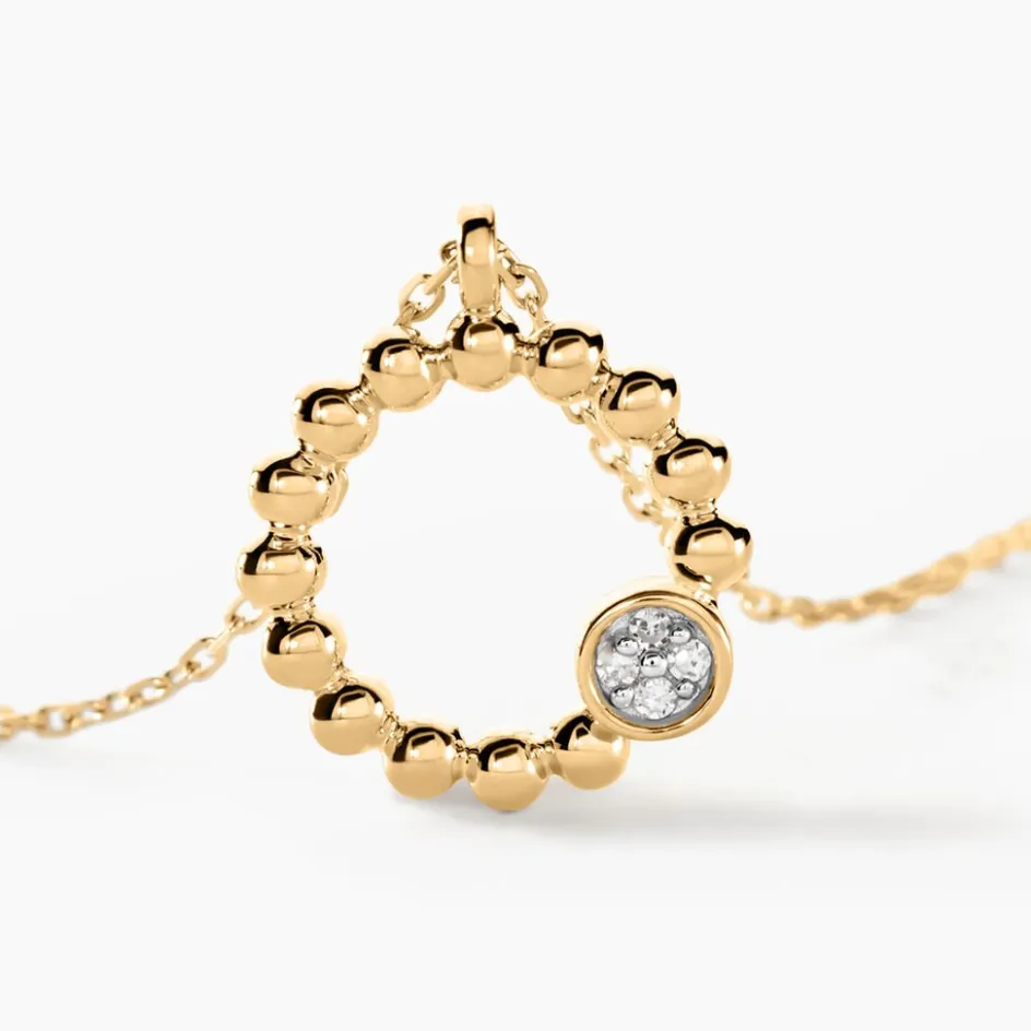 Collier Or Jaune 375/1000 Pastille Sur Cercle Effet Perle Pavage Diamants 0.015cts Maille Forcat 42+2cm