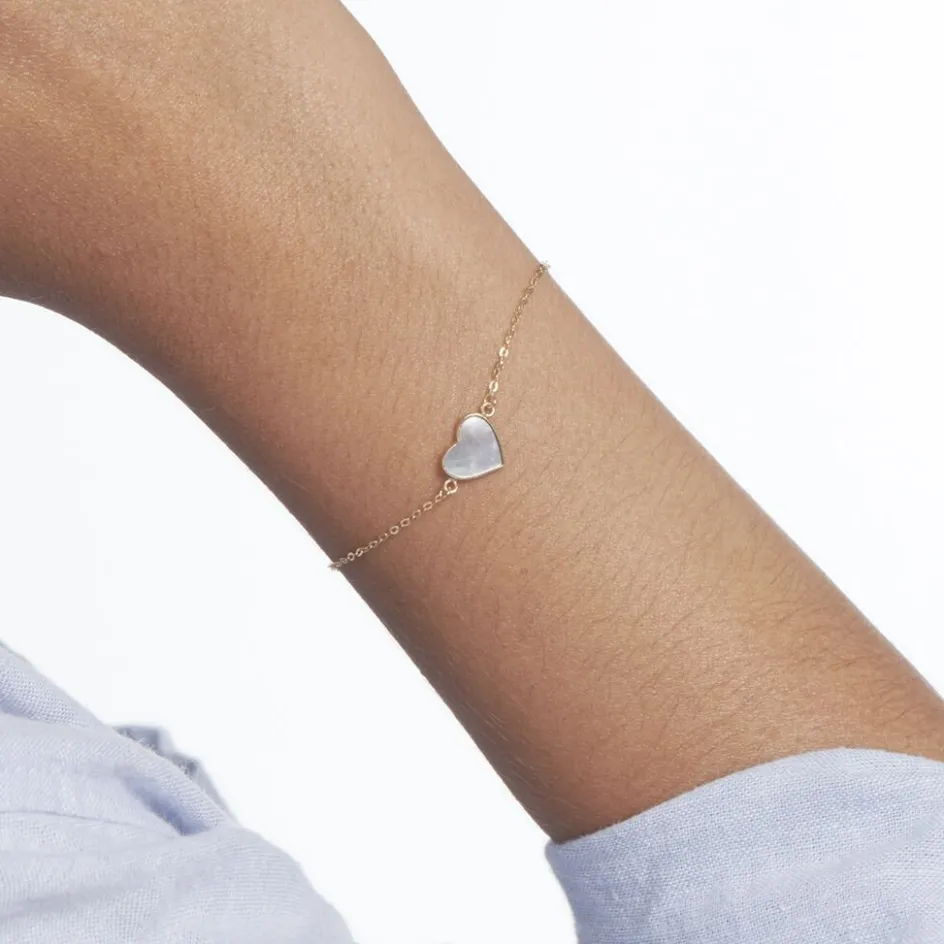 Bracelet Or Jaune 375/1000 Coeur Nacre Blanche Maille Jaseron 16+2cm