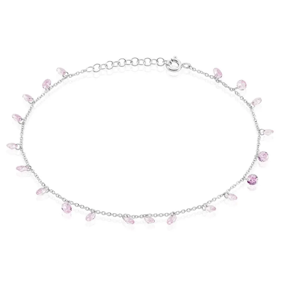 Chaîne De Cheville Argent Blanc 925/1000 Pampilles Oxydes De Zirconium Roses Maille Forçat 25cm