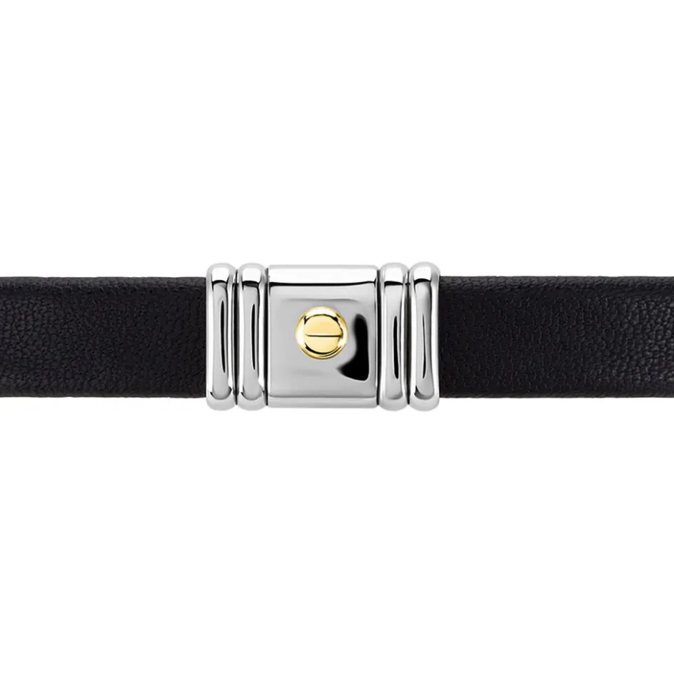 Bracelet Jourdan Homme Cuir Noir Acier Gris Decor Or 21.5cm Jh300006b