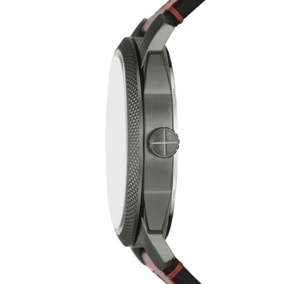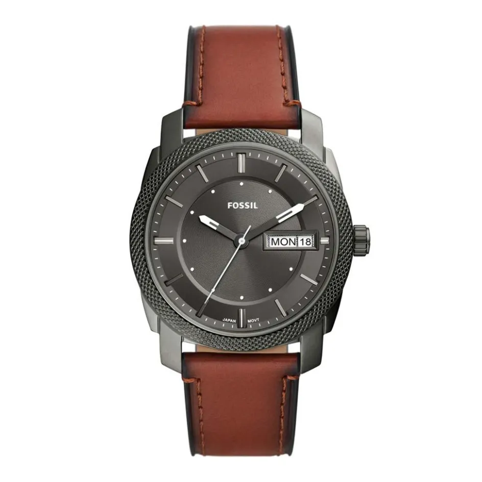 Montre Fossil Machine Acier Gris Ronde Quartz 42mm Fond Gris Bracelet Cuir Marron Fs5900