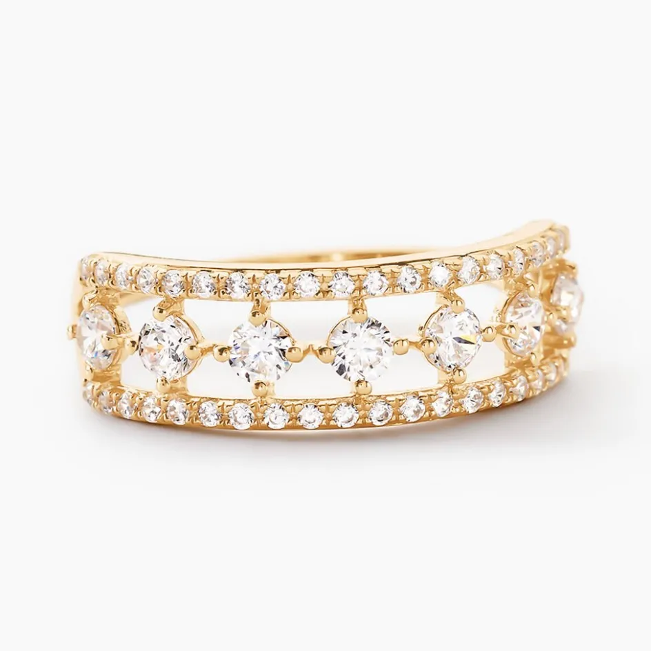 Bague Or Jaune 375/1000 Triple Rangs Ajourés Oxydes De Zirconium Serti Griffes