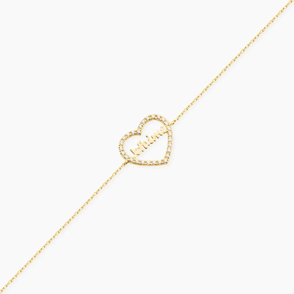 Bracelet Or Jaune 375/1000 Entourage Coeur Message Je T’aime Oxydes De Zirconium Serti Pavage Maille Forçat 18cm