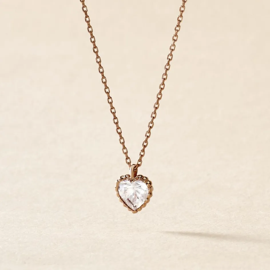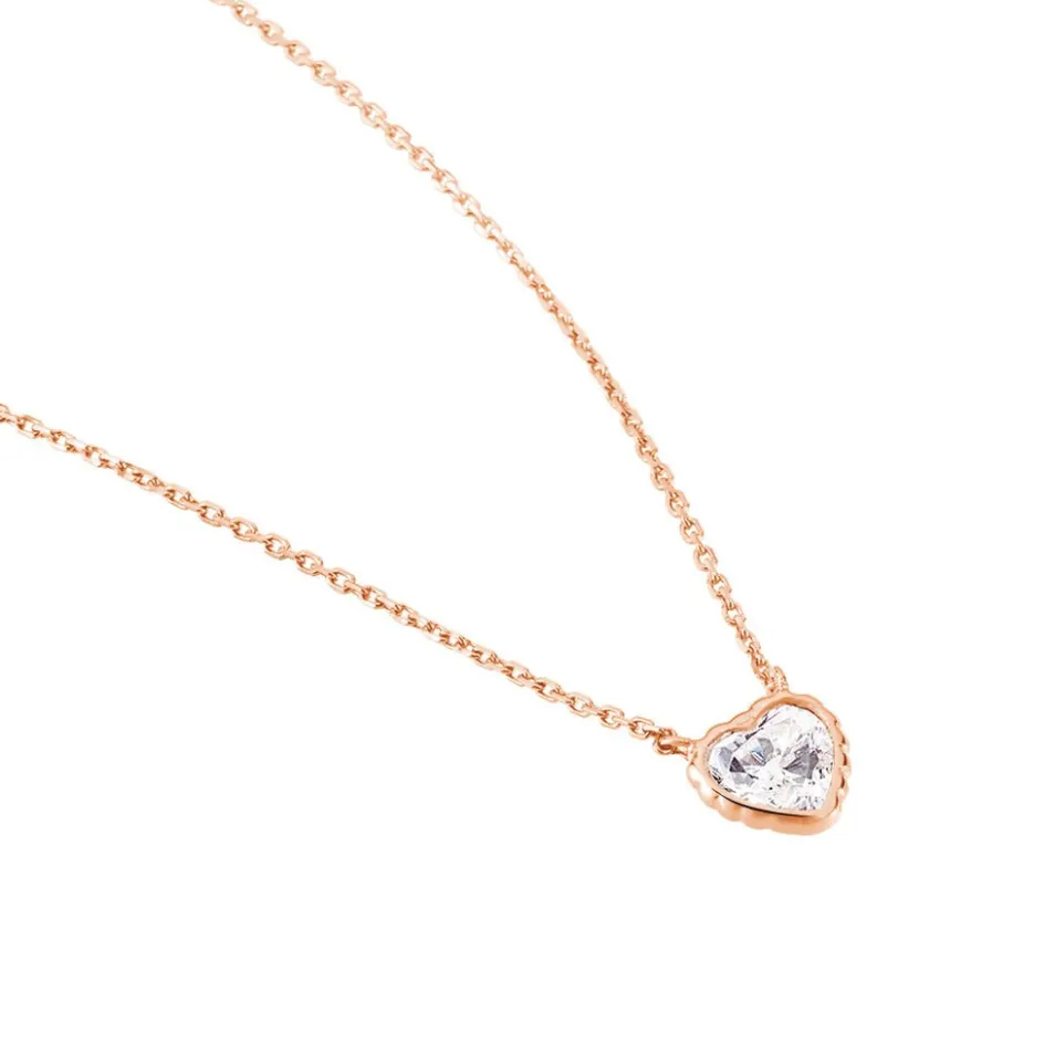 Collier Or Rose 375/1000 Solitaire Forme C艙ur Oxyde De Zirconium Serti Clos 43cm
