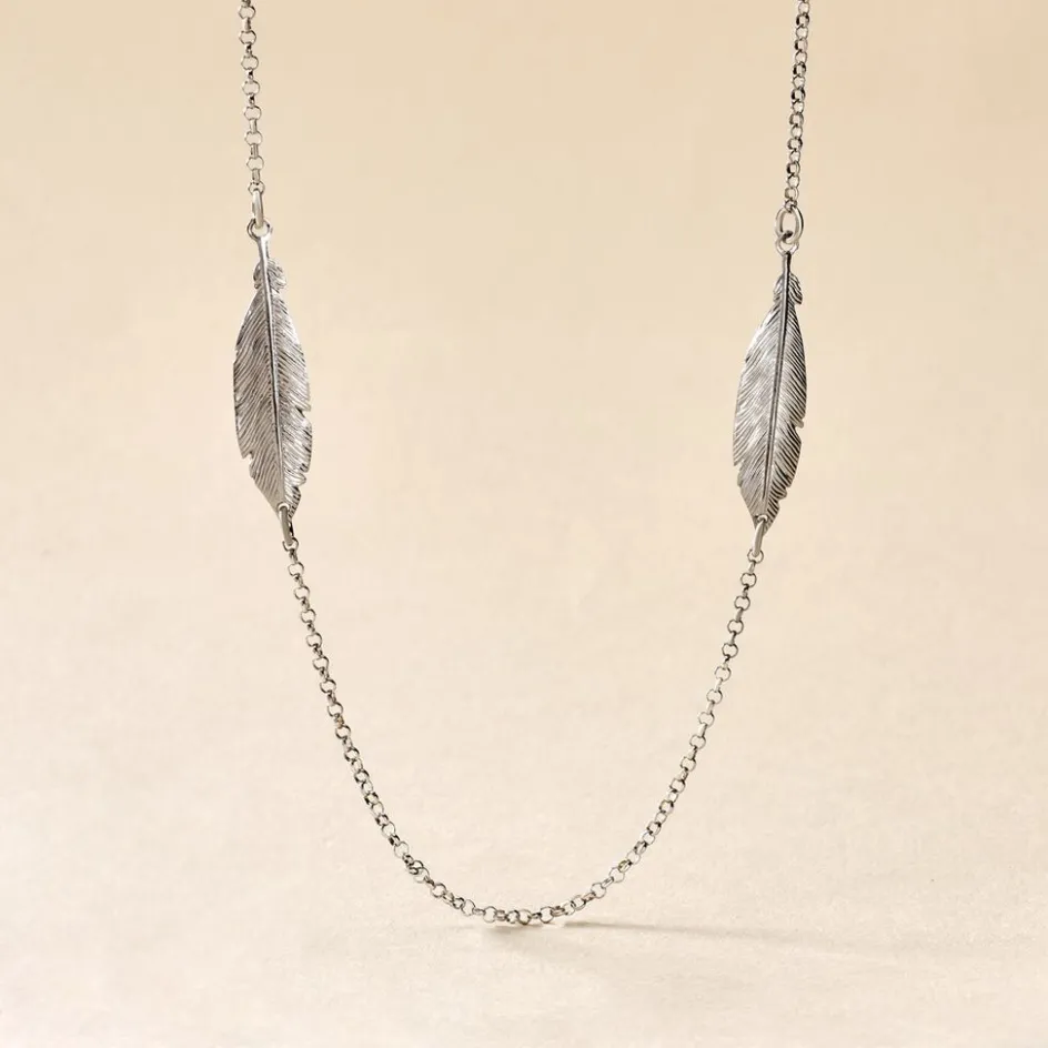 Collier Sautoir Argent Blanc 925/1000 Plumes Maille Forcat 80cm