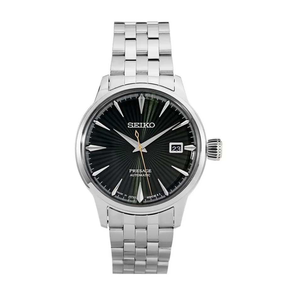 Montre Seiko Presage Acier Blanc Ronde Automatique 40.5mm Fond Vert Bracelet Acier Blanc Srpe15j1