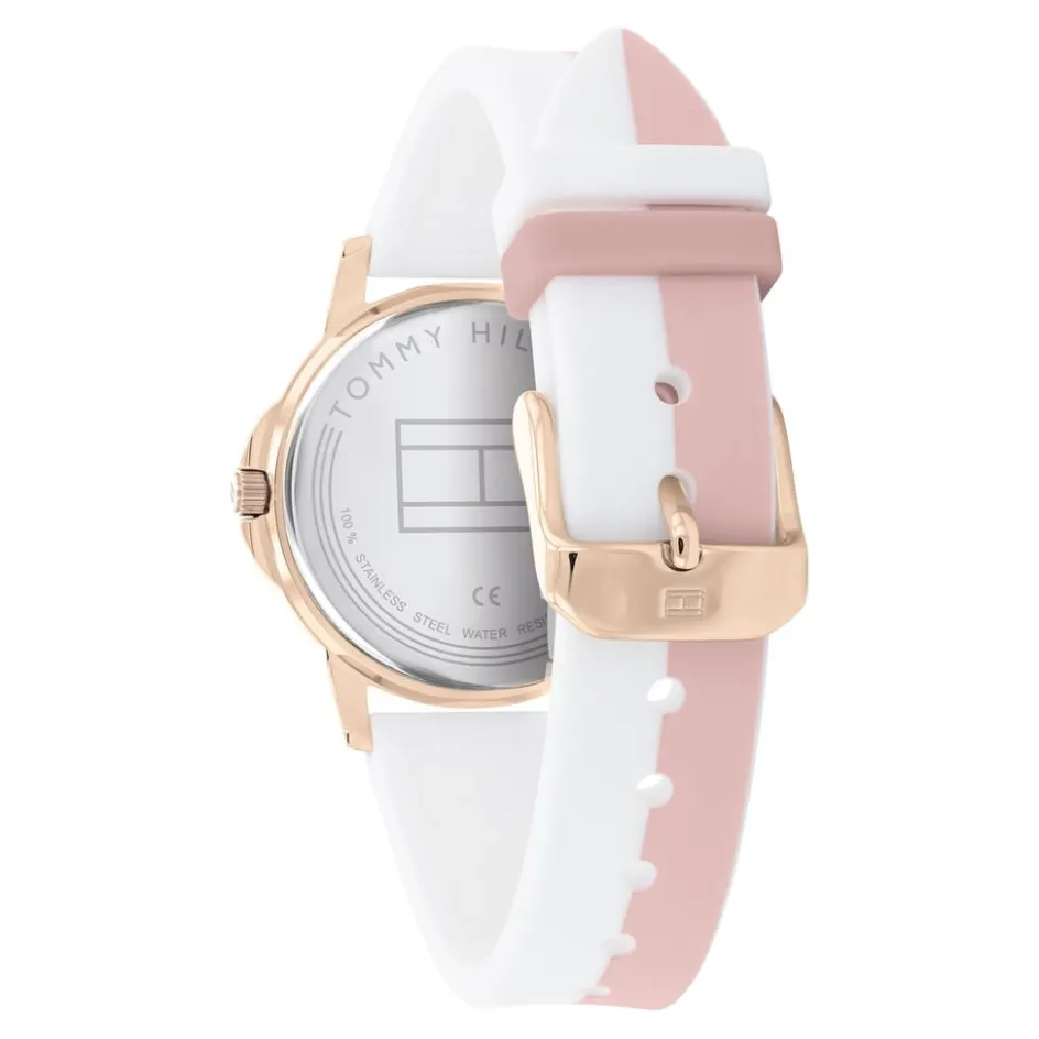 Montre Tommy Hilfiger Girls Acier Doré Ronde Quartz 32mm Fond Argenté Lunette Dorée Bracelet Silicone Rose Blanc 1720015